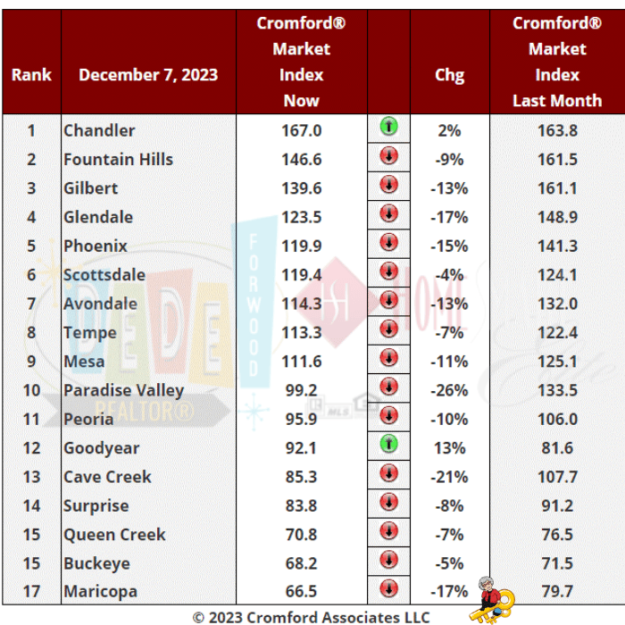 one of my favorite ways to track Valley trends. There was an average decline of 9.9% in the Cromford® Market Index for the 17 cities above. This is an improvement over the 13.1% decline we saw last week, but it is still a negative move. We a watching to see which cities start to move in a positive direction. So far we have Goodyear which has raised its CMI an impressive 13% and is now back in the balanced zone after spending 55 days as a buyer’s market. Chandler has also shown an improvement over the last month, but this is a less impressive 2%. However it gets credit for staying at the top of the table and its lead over Fountain Hills has opened up significantly.
