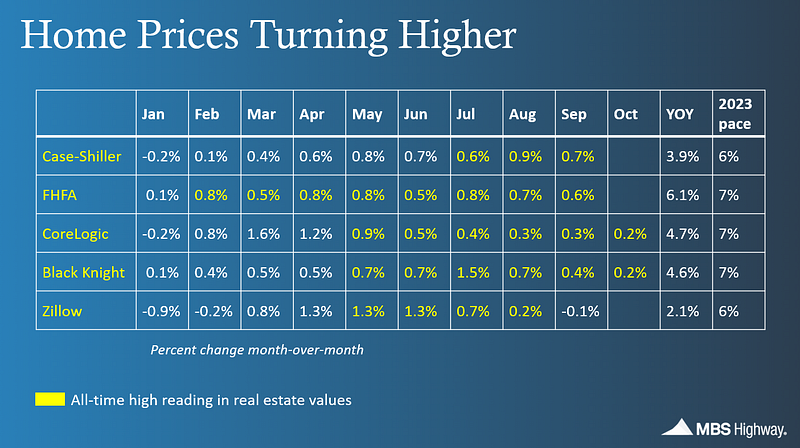 Slower, but still rising. Even with average 30-yr mortgage rates briefly exceeding 8% in October, home prices continued to rise. The housing data providers Black Knight and Core Logic both saw home prices 0.2% MoM during the month. That means that year-to-date, prices have risen 6%.