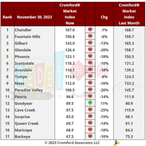 City Showdown: While some cities basked in positivity, the majority faced challenges. Paradise Valley, Cave Creek, Glendale, Phoenix, Surprise, Mesa, Peoria, Maricopa, Queen Creek, and Avondale experienced declines. However, the standout performer? Goodyear, marching towards a balanced status, escaping its buyer’s market label.