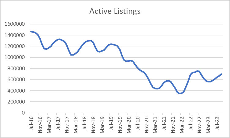 Although almost all pundits predicted rates would fall in the second half of 2023, the typical 30-year fixed mortgage rate is now around 8.03%, up from 7.33 a month ago. In historical terms, this is unexceptional, but the majority of home-buyers are too young to have experienced rates at this level before. Unless they are working with a seller who is prepared to buy-down their interest rate, the majority of buyers lack enthusiasm to jump in at this point and many are choosing to wait until times get easier. People would still like to buy a home eventually, so latent demand is rising while actual demand falls.