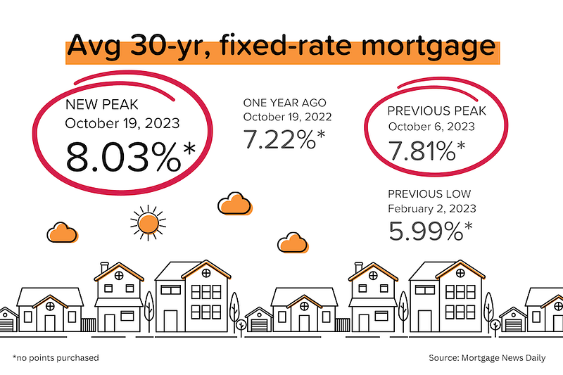 8.03%. That was the average rate for 30-year, fixed rate mortgages on October 19, according to Mortgage News Daily. As a reminder, on February 2, 2023, the average rate was 5.99%. What drove the latest spike? Read on.
