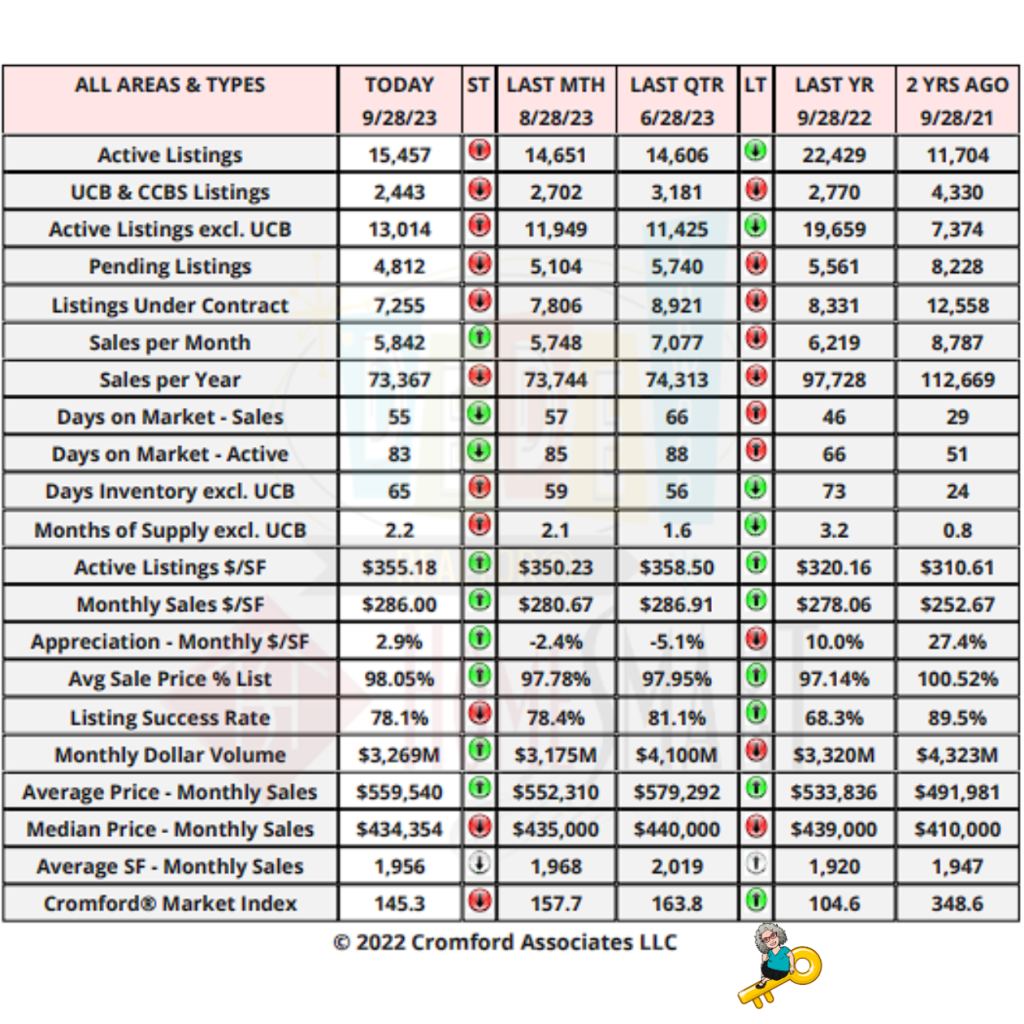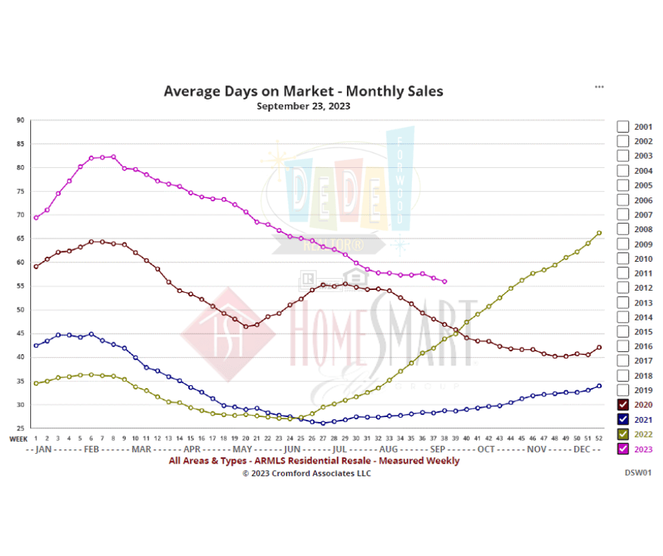 If you were basing your view on this chart, you would take away the impression that the market is improving for sellers and has been since February. This is not true. The market stopped improving back in June and is getting increasingly difficult as inventory starts to build and demand withers in the face of affordability pressures. Yet the average days on market for closed listings continues to fall.