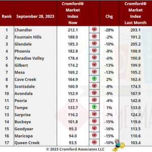 Most negative again this week is Chandler, down 28%, though it remains in first place. Goodyear, Maricopa, Buckeye, Mesa and Gilbert are also much weaker than this time last month, down at least 13%.