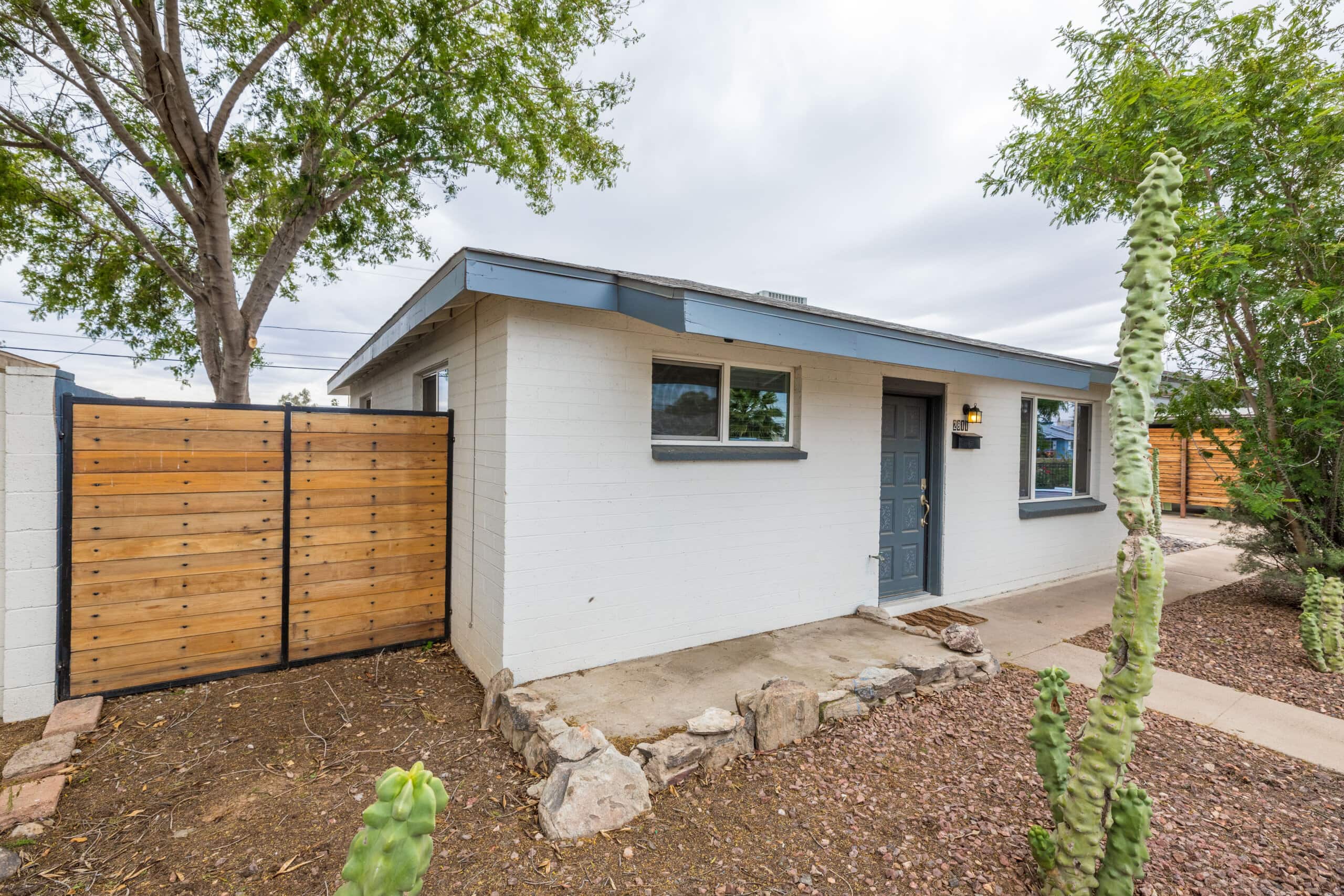 Immaculate, stylishly updated 3-bed + office/den, 2BA retreat! This charming home seamlessly blends retro vibes with modern living, featuring light-filled rooms, historic arches and awesome built-ins. The spacious, upgraded eat-in kitchen boasts s/s appliances, granite counters, ample cabinets, gas range and room for both an island AND a large table! Convenient flex room-office/den/home gym off kitchen. The primary bedroom offers access to a large covered patio and private bath. Outside, unwind in the serenely-landscaped backyard with covered patios, pavers, turf, and cool fencing. Additional storage space available in the laundry room. Revel in the comfort of newer AC and windows, and appreciate the proximity to the light rail and I-17. Make this light and bright sanctuary yours today!