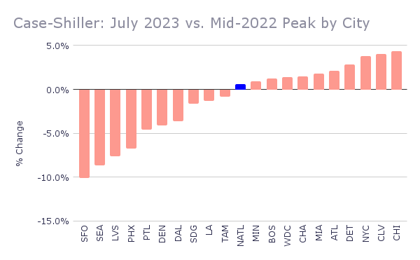 Ok, how about some good news (for homeowners anyway)? The Case-Shiller national home price index for July rose 0.6% MoM and hit a new all-time high. The modest decrease in prices that we saw in 2H 2022 has already been erased. 10 out of 20 big city indexes are also at new highs, and some of the hardest-hit west coast cities are seeing prices rebound quickly. [S&P Global]