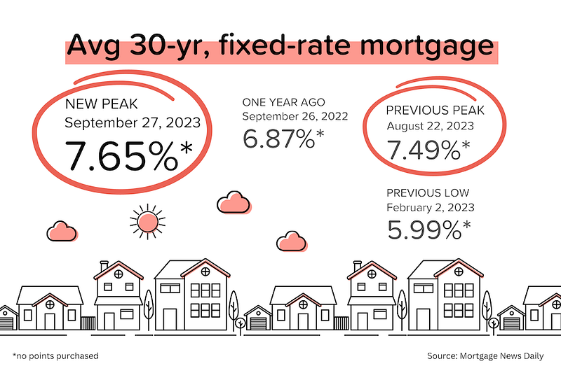 Average 30-yr mortgage rates just set another new, two-decade high: 7.65%. Yields have been rising across the globe in response to ‘higher for longer’ commentary from central bankers. In addition, the Brent crude oil price is approaching $100/barrel, causing concerns about a rebound in inflation. [Mortgage News Daily]