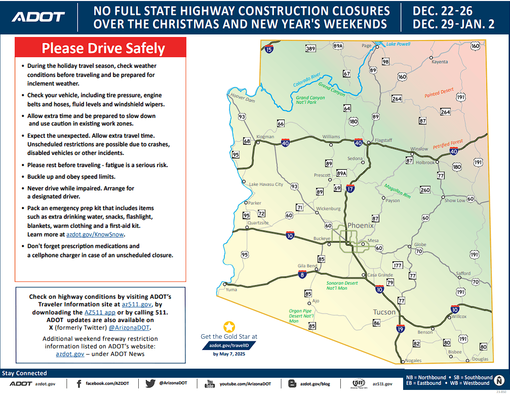 ADOT: No scheduled highway closures over Christmas, New Year’s weekends. Drivers should stay alert, expect the unexpected if planning holiday trips.