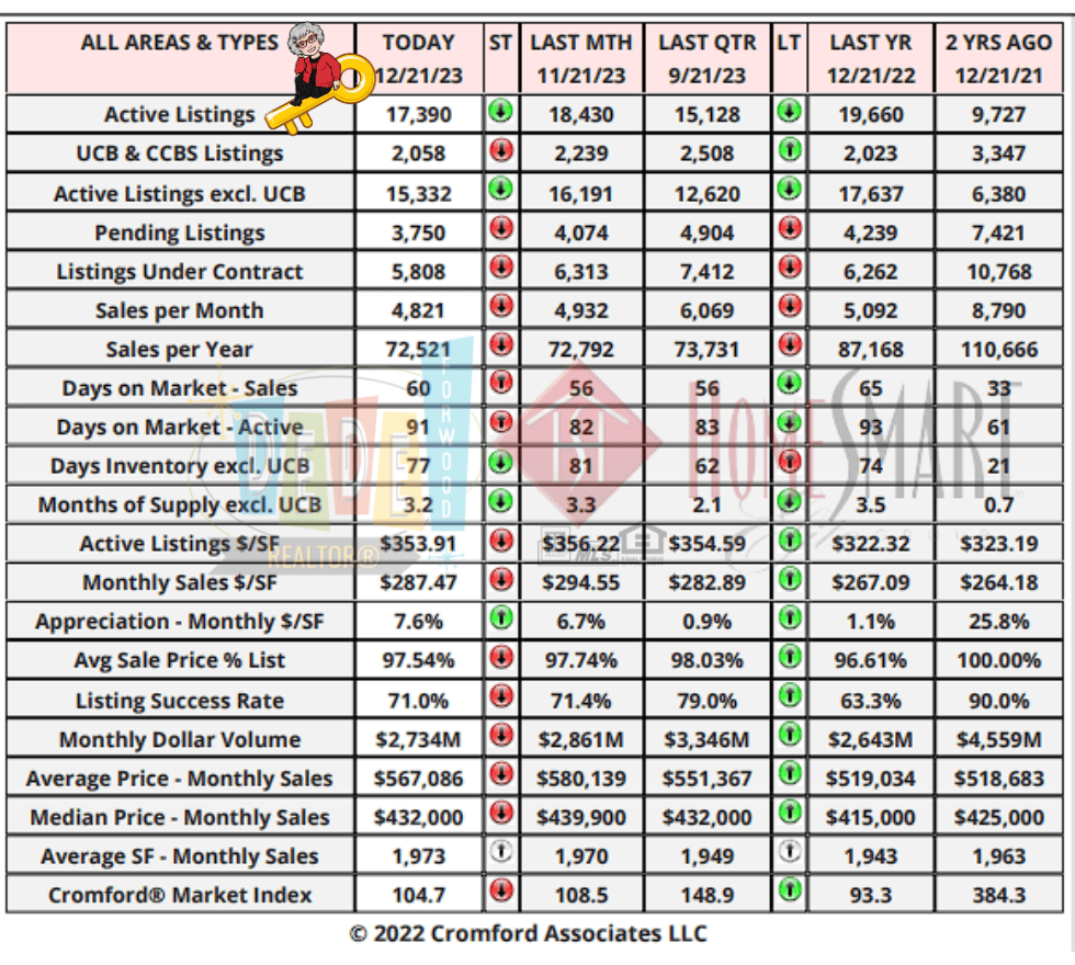 Despite lower interest rates, the market has not experienced a surge in new signings. The current count of homes under contract stands at 5,808, the lowest since January 8 and significantly below the 6,262 recorded at the same time last year. Despite yesterday’s 30-year fixed loan rate at 6.64% and the 30-year FHA rate at 6.14%—considerably lower than a month ago and well below rates in mid to late October—buyers seem to be holding off until January before committing to house-hunting in December.