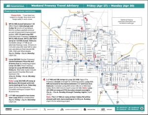 Northbound SR 51 is fully closed between I-10 and Colter St from 9 p.m. Friday to 5 a.m. Monday. Eastbound Loop 202 (Santan) is closed between Price Rd and Arizona Ave in Chandler during the same window. Northbound I-17 narrows to two lanes near Loop 303 Friday night into Saturday, plus some overnight ramp closures.