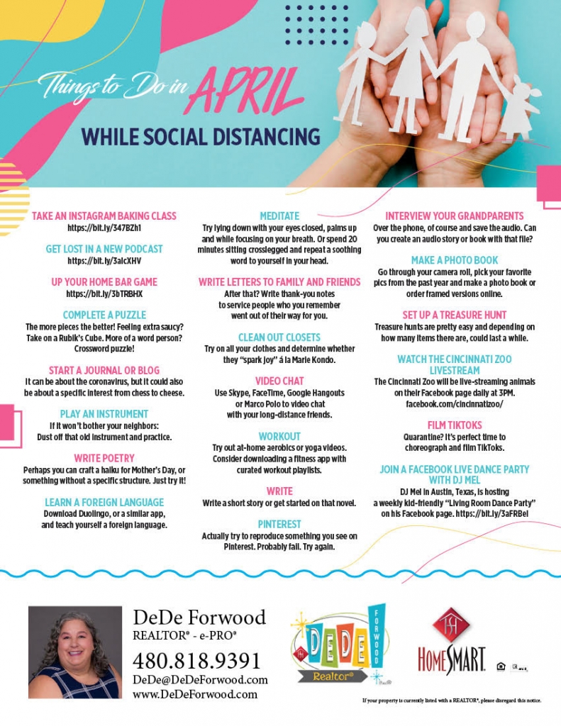 There's plenty to do online and in-person to keep yourself safe...AND entertained! Here's some ideas: Take an Instagram baking class Get lost in a new Podcast Upgrade your bar game Do a Crossword Puzzle Start a blog Learn a foreign language Write letters to family and friends Clean out your closet Daily Workout Film TikToks Family friendly Dance Party every Week with DJ...