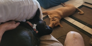 Iām all caught up on my Hallmark Westerns and Outlander, doing twice-a-day dog walks, and my pups were thrilled to see Grandpa (PawPaw) today after he did the weed-and-feed and spray ā they hadnāt been allowed over all week!